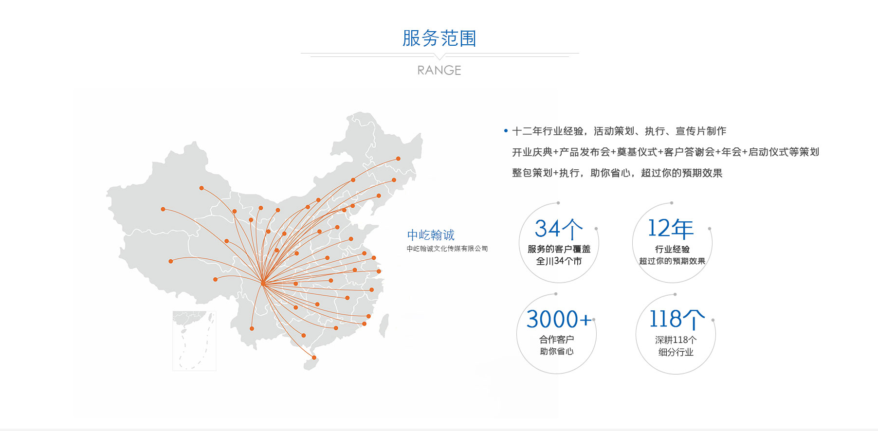 历经多年深耕,公司已形成 “公关活动、展览展示、品牌战略服务、影视制作” 四大核心业务板块。从创意策划到落地执行,从品牌塑造到视觉呈现,从活动运营到影像记录,中屹翰诚始终以专业视角与创新理念,满足客户多元化需求。凭借出色的服务品质与专业能力,公司在市场中稳步前行,服务版图已拓展至政府、金融、媒体、演艺、建筑等 118 个细分行业,与超 3000 家客户建立深度合作关系,以实力赢得广泛认可与信赖。